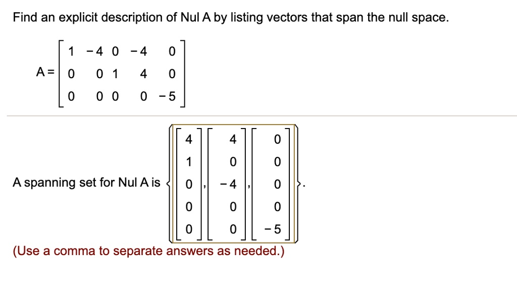 Find An Explicit Description Of Nul A By Listing Vectors That Span The Null Space 130 Homeworklib